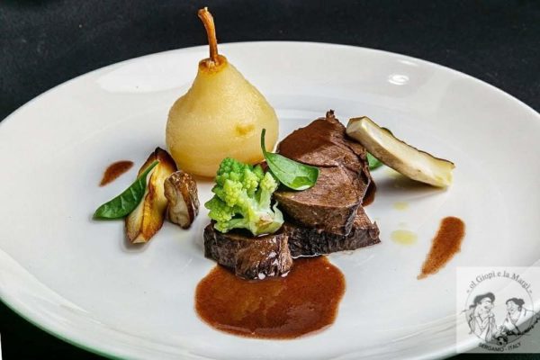 / Asino stufato al Barolo con pera speziata al moscato e polenta